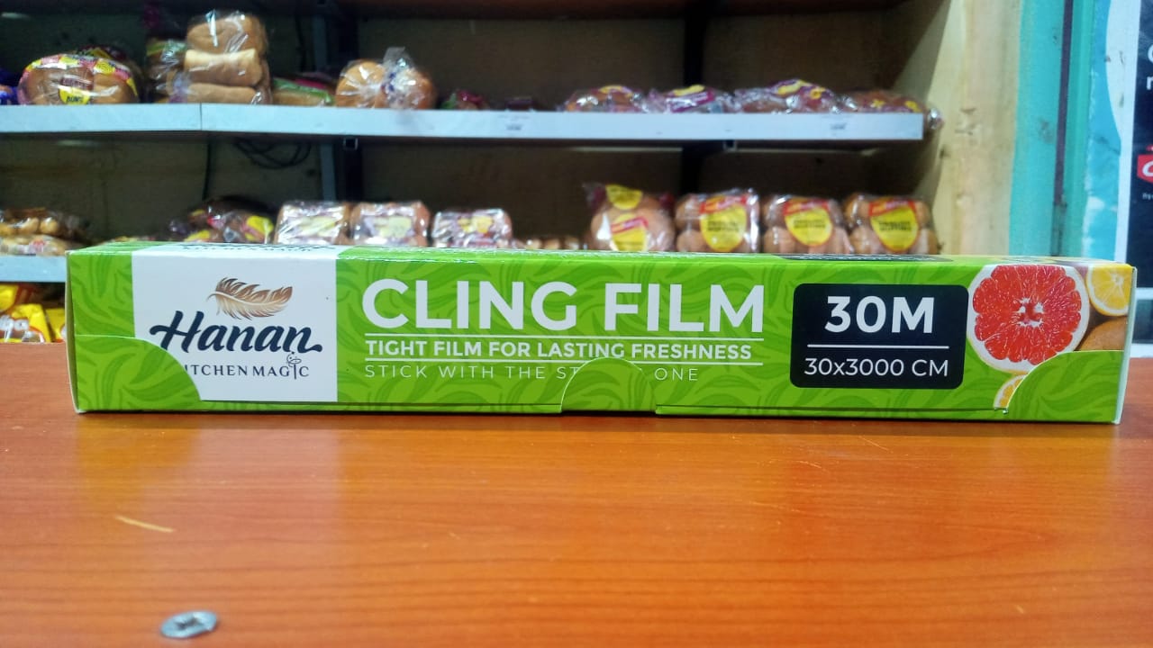 DIMENSIONS ARE 30CM WIDTH BY 30M LENGTH.THIS IS THE NEW LOOK OF HANAN CLING FILM